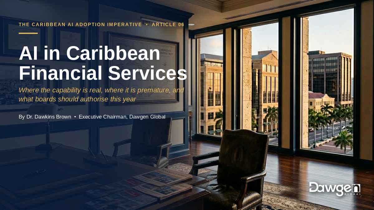 Act III of the series now begins. Where Acts I and II addressed the conceptual and governance foundations, Act III turns to application: the specific domains where AI is reshaping Caribbean institutional practice over the next twenty-four months. There are three of those domains addressed in the next three articles. Financial services, addressed in this article, comes first because the sector’s scale and supervisory exposure make every prior editorial argument converge here. Article 7 will address the Caribbean workforce transition — how AI is reshaping the work itself. Article 8 will address the finance function specifically — how AI is reshaping the work of the CFO and the finance team.