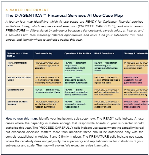 This article has done four things. It has named the four sub-sectors of Caribbean financial services and made the case that a single ‘financial services’ frame is too coarse for the AI conversation. It has introduced the D-AGENTICA™ Financial Services AI Use-Case Map as the named instrument for this article — the sixth in the series — differentiating sixteen specific use case scenarios as READY, PROCEED CAREFULLY, or PREMATURE. It has named the three deployment patterns I see consistently producing better outcomes in our region. And it has named the three failure modes I see consistently destroying capital, so that boards can recognise them early.