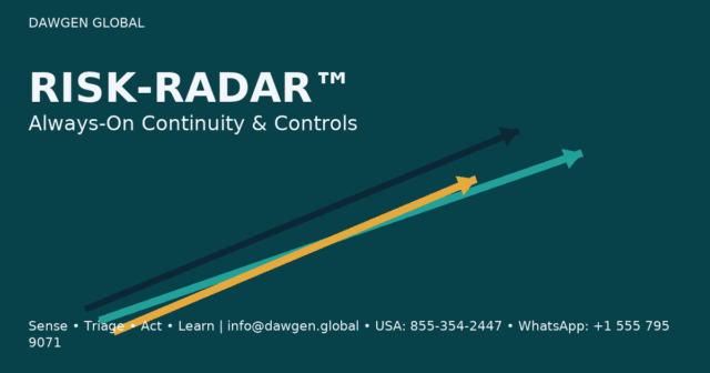 Crises are rarely a surprise—only our readiness is. Operational incidents, cyber threats, fraud, storms, FX swings, supplier failures: most signal themselves days or weeks in advance. The problem is noise and slow decisions. RISK‑RADAR™ is Dawgen Global’s continuity and controls system that converts scattered warning signs into a single operating rhythm: sense → triage → act → learn. It links risk indicators to executive thresholds, pre‑approved playcards, and post‑event learning so the organization becomes failure‑resistant and recovery‑fast.
