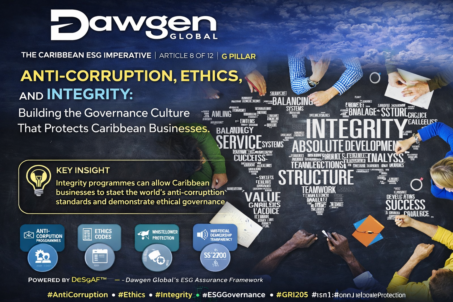 This article — the eighth in Dawgen Global’s The Caribbean ESG Imperative series — provides Caribbean businesses with a comprehensive guide to anti-corruption governance, ethics programme design, whistleblower protection, beneficial ownership transparency, and the integrity culture that is the ultimate foundation of ESG credibility. We examine the Caribbean corruption risk landscape with the honesty it deserves. We provide a detailed framework for building an anti-corruption programme that meets international standards. We address the design of effective ethics codes. We examine whistleblower protection as a governance mechanism rather than a compliance obligation. And we connect integrity governance to DESGAF™ — showing how defining ethical standards (Pillar 1), embedding them in management systems (Pillar 2), and assuring their implementation (Pillar 5) produce the integrity foundation that every other dimension of ESG requires.