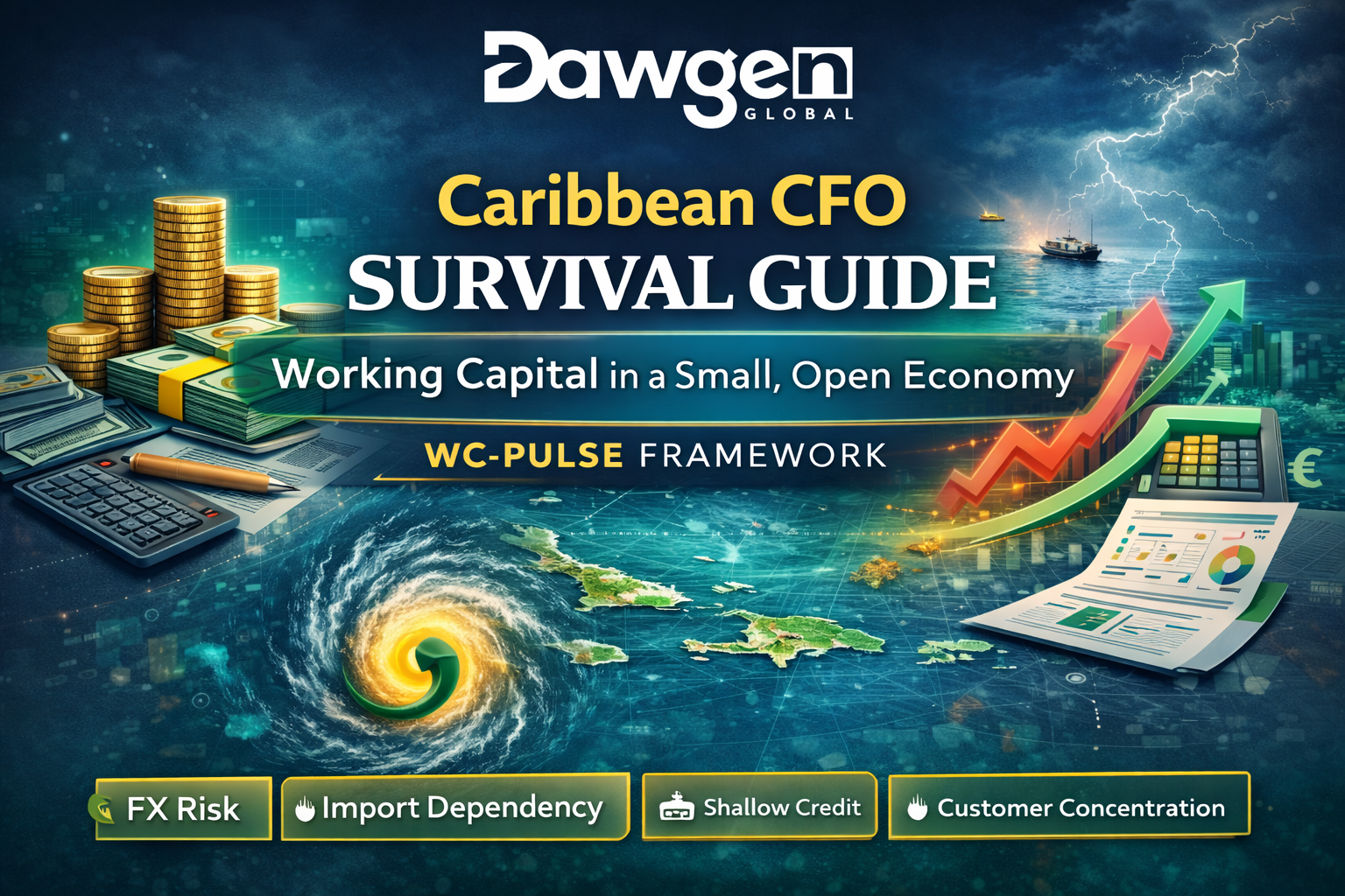 Dawgen Global is a Caribbean-headquartered, globally connected advisory firm delivering transformation across Strategy, Finance, Operations, Technology, and Governance. With deep roots in Jamaica, Trinidad and Tobago, Barbados, and the wider CARICOM region, we understand the unique operating environment that Caribbean finance leaders navigate every day. Our Working Capital Advisory practice is powered by the proprietary WC-PULSE Framework™, calibrated specifically for the realities of small, open economies.