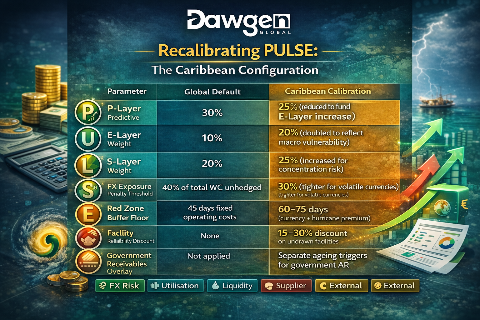 A Bridgetown distribution company relied on two revolving credit facilities totalling US$8 million. When one of the providing banks announced a reduction in its Caribbean commercial-lending portfolio, the company received notice that its US$3 million facility would not be renewed at the next annual review. Under the standard PULSE configuration, the company’s L-Layer score would have remained adequate because the remaining US$5 million facility was undrawn. Under the Caribbean calibration, however, the Facility Reliability Discount had already reduced the undrawn facility’s contribution to the L-Layer score by 25 per cent, and the loss of the second facility triggered an immediate zone transition to Red. The advance warning gave the CFO four months – rather than the typical four weeks – to negotiate a replacement facility with an alternative bank, avoiding the panic pricing and unfavourable covenants that typically accompany emergency refinancing.
