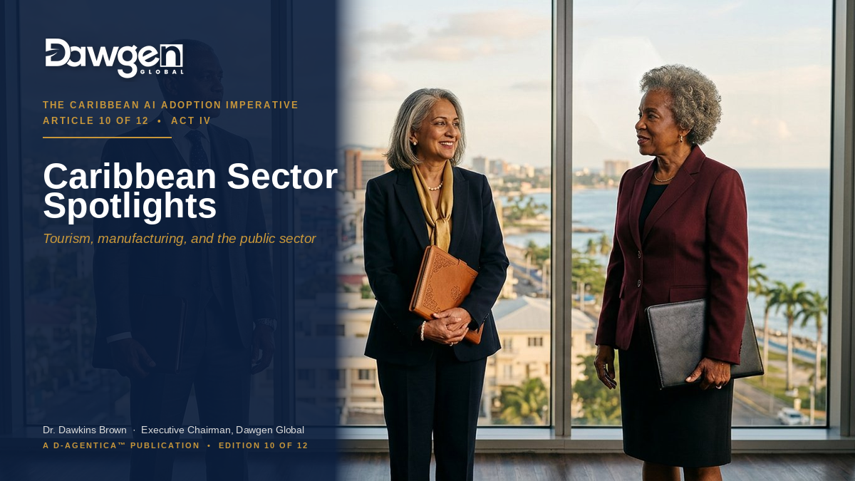 The tenth article of twelve, and the second article of Act IV — The Decision. Article 9 set out an AI governance frame in the abstract — eleven decisions, a Decision-Rights Matrix, two structural questions. Article 10 asks whether the frame holds up against three specific Caribbean sectors: tourism, manufacturing, and the public sector. The point of this article is not to deliver three short case studies. It is to demonstrate that the contextual considerations differ enough across sectors that the same governance frame produces different answers for each — and to give Caribbean directors a tool for locating their own sector against the AI considerations that matter most for it. By the end of this article you will be able to: 1. Recognise four cross-sector dimensions — regulatory exposure, data-residency intensity, physical-world coupling, and public-legitimacy stake — that, in our engagement experience, determine where AI governance pressure falls hardest in any given Caribbean sector. 2. Apply the D-AGENTICA™ Sector AI Adoption Profile as the named instrument, locating your institution’s sector against those four dimensions and identifying the two or three considerations that should anchor your AI governance work this year. 3. Read the three Caribbean sector spotlights — tourism, manufacturing, and the public sector — for the structural lessons each carries, and recognise which lessons translate to your own sector even when the surface details do not. |
