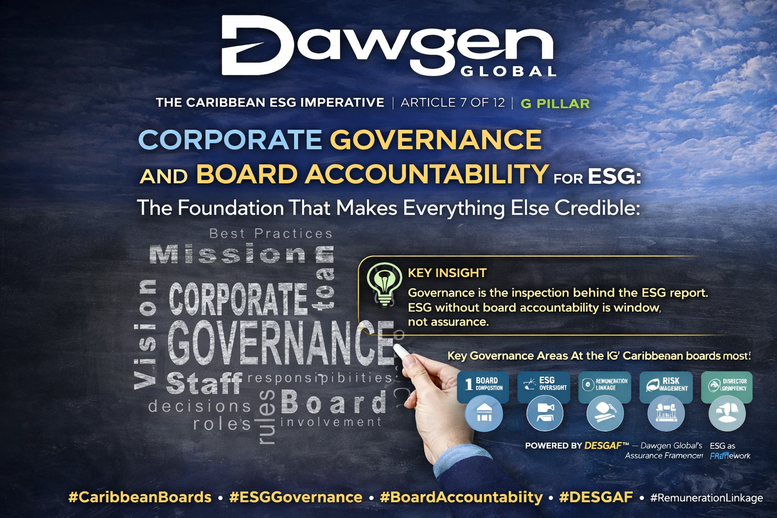 This article — the seventh in Dawgen Global’s The Caribbean ESG Imperative series — opens the Governance pillar by examining board accountability for ESG in depth. We map the full G pillar topic universe. We examine what genuine board ESG oversight looks like — from governance structures and committee design through director competencies and ESG-linked remuneration. We review the corporate governance codes that apply to Caribbean businesses and how they interact with international expectations. We address board composition, independence, and diversity. We explore the integration of ESG into enterprise risk management. And we connect governance to DESGAF™ — showing how defining governance accountability (Pillar 1), embedding governance disciplines (Pillar 2), and assuring governance disclosures (Pillar 5) together produce the credible governance foundation that every Caribbean ESG programme requires.