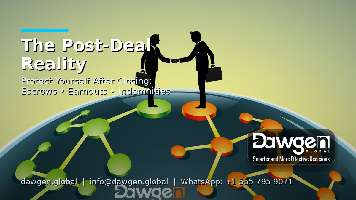 Closing is not the end of risk—it is the start of a new phase: post-deal exposure. Many sellers celebrate completion, only to face months (or years) of uncertainty through escrows, holdbacks, earnouts, and warranty/indemnity claims. This article explains the three main post-close value “leaks,” how buyers typically structure protections, and what sellers can do to reduce duration, cap liability, and avoid disputes. Using the Dawgen Global D.E.A.L.M.A.K.E.R. Framework™, we show how sellers convert a negotiated price into durable, bankable value—not just at closing, but after closing.