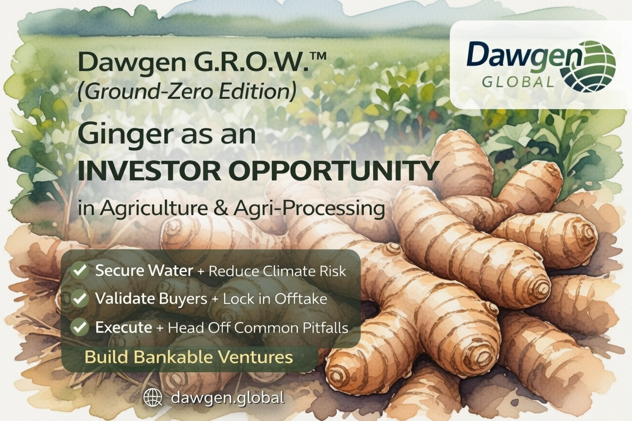 Ginger can be a high-value opportunity—but only when it is engineered properly. Dawgen G.R.O.W.™ (Ground-Zero Edition) helps investors build bankable agriculture and agri-processing ventures from scratch—ground platform, returns logic, offtake certainty, and the execution system that makes performance repeatable.
