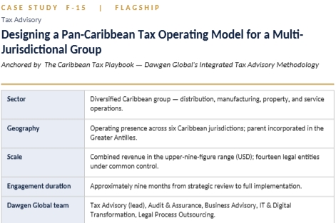 Dawgen Global was retained to design and operationalise a pan-Caribbean tax operating model for the group: a single, coherent, strategically-governed approach to the group’s tax position across all six jurisdictions, operationalised through a redefined central tax function, supported by consistent methodology, documentation, and technology.