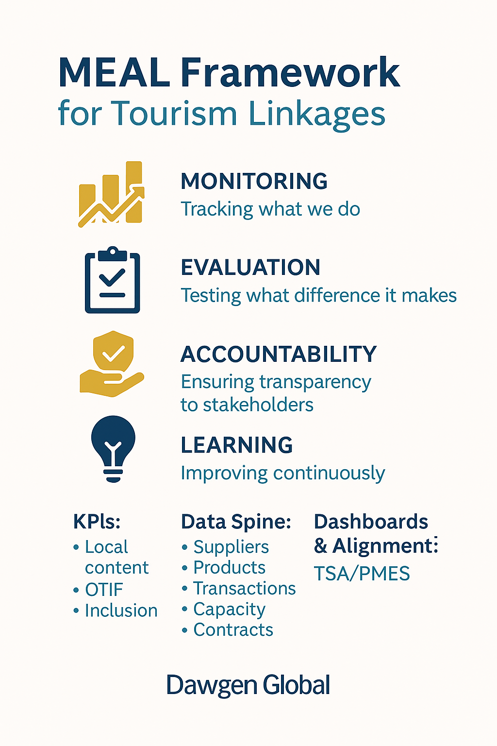 In tourism, MEAL is the difference between announcing a Local Content Policy and actually raising the share of hotel and attraction spending going to domestic suppliers, increasing inclusive employment, and lifting Micro, Small and Medium Tourism Enterprises (MSTEs) into higher-value segments of the Tourism Value Chain (TVC) and even Global Value Chains (GVCs).