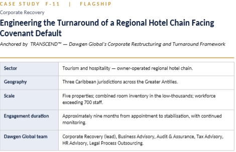 The chain’s founder, who remained its Chief Executive, had the realism to see the situation clearly. A third waiver refusal would trigger cross-default across the syndicate, would expose the chain to enforcement action, and — in practical Caribbean commercial terms — would result in the loss of the chain under distressed conditions. The founder’s objective was not merely to avoid default; it was to emerge from the period of stress with the portfolio intact, the founding family’s equity preserved to a meaningful extent, and employment across the chain protected to the greatest extent possible. The chain’s board, including two independent directors, formally resolved to appoint an independent corporate recovery advisor. Dawgen Global was retained.