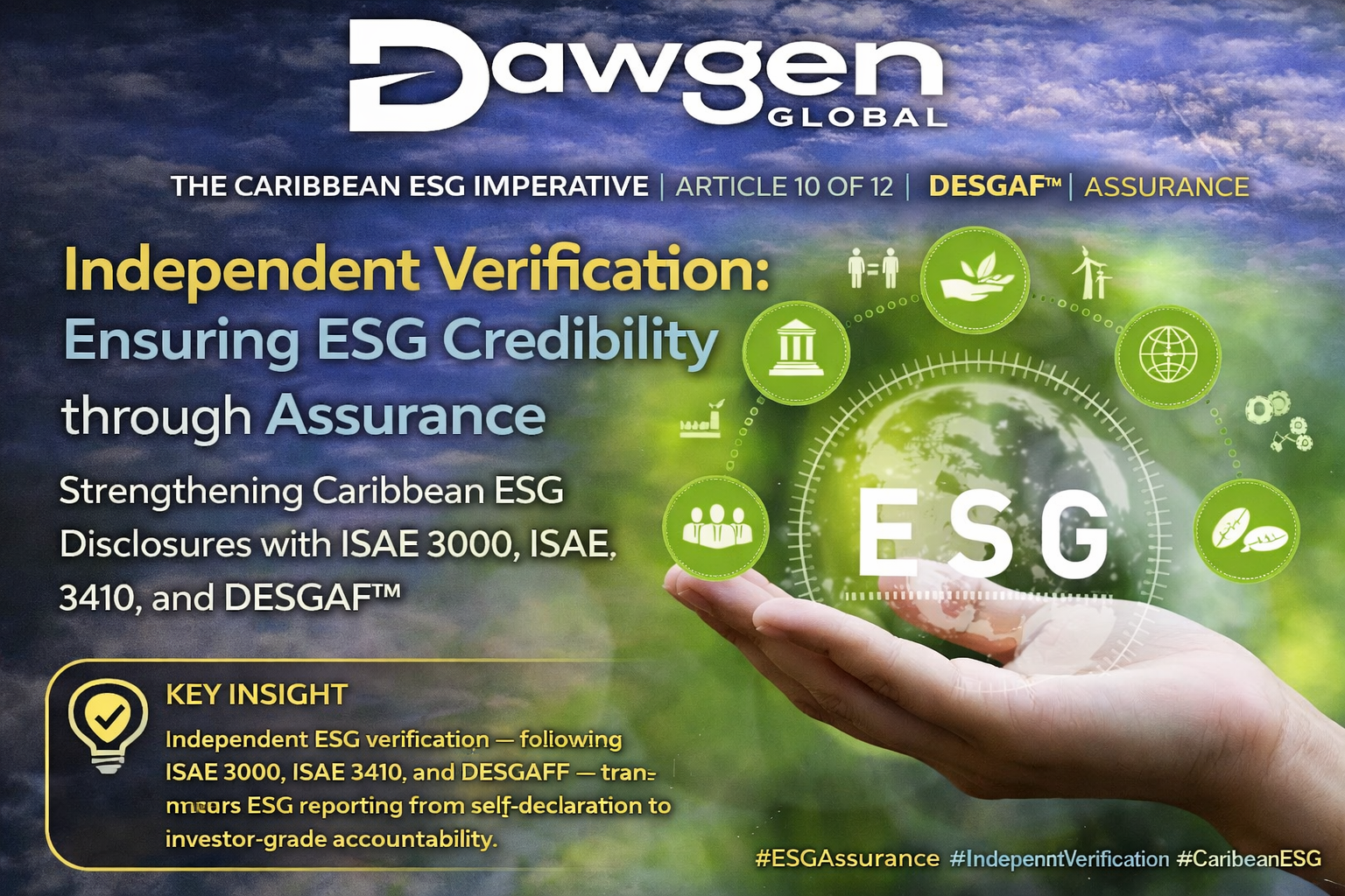 This article — the tenth in Dawgen Global’s The Caribbean ESG Imperative series — examines ESG assurance in depth. We explain ISAE 3000 — the international assurance standard under which ESG assurance is conducted. We compare limited and reasonable assurance levels in detail. We examine DESGAF™ as a comprehensive ESG assurance framework — mapping exactly what the assurer does at each of the six DESGAF™ pillars. We provide guidance on assurance scope selection — what to assure first, and how to expand scope over time. We examine the growing market access requirements for assurance. And we position Dawgen Global as the Caribbean’s specialist ESG assurance provider — the firm that combines the technical assurance capability with the regional business context understanding that Caribbean ESG assurance requires.
