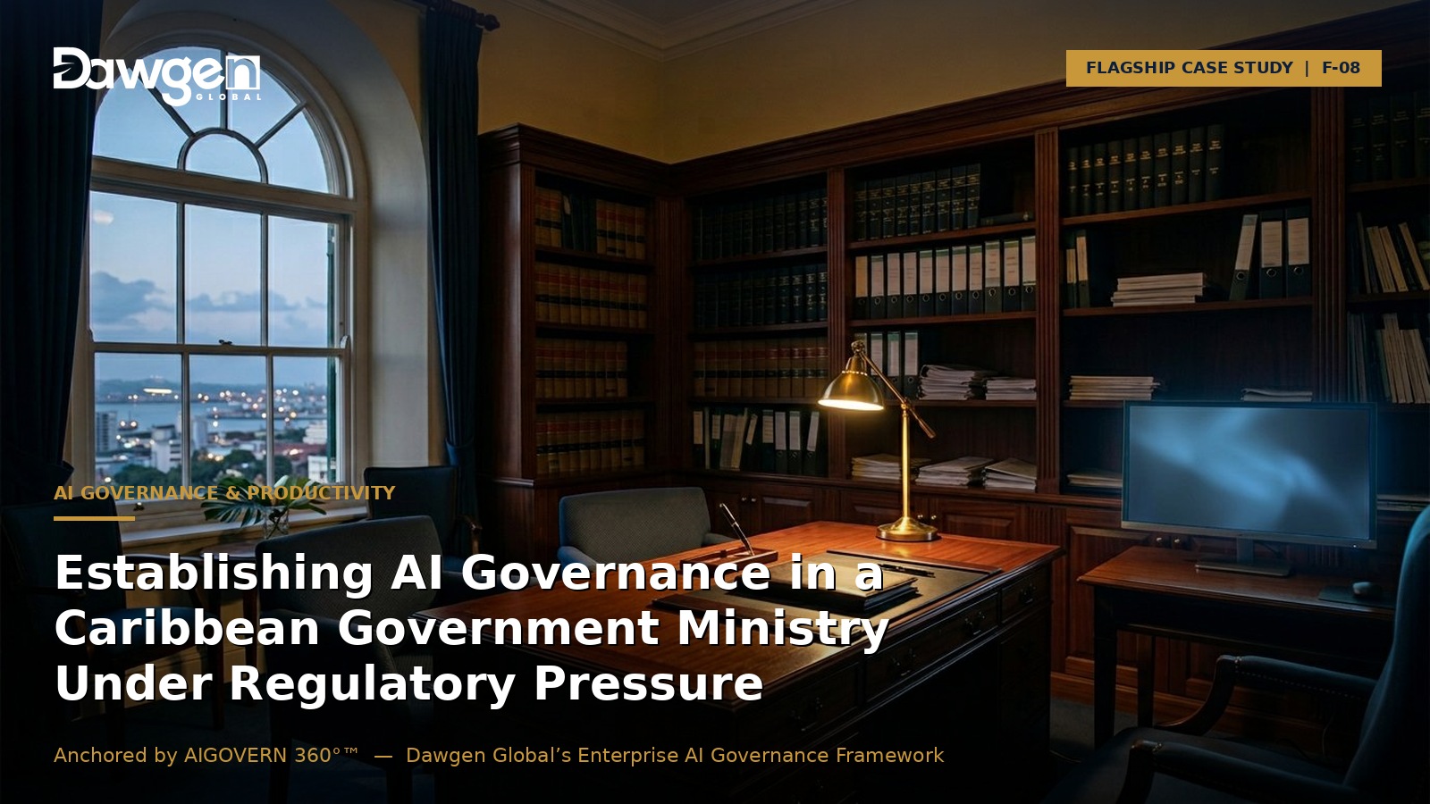 A Caribbean central government ministry, with direct responsibility for both public service delivery and sectoral regulation, had recognised that artificial intelligence was becoming materially present in its operations — not through a formal adoption strategy, but organically, through the initiative of individual officers and directorates. In parallel, the ministry’s minister was increasingly being asked in parliamentary sittings and in international fora what governance arrangements the ministry had in place for its use of AI, what standards it was applying to its regulated entities, and what steps it was taking to ensure that AI would neither disadvantage citizens nor expose national datasets to inappropriate risk. The ministry did not yet have credible answers to any of these questions.