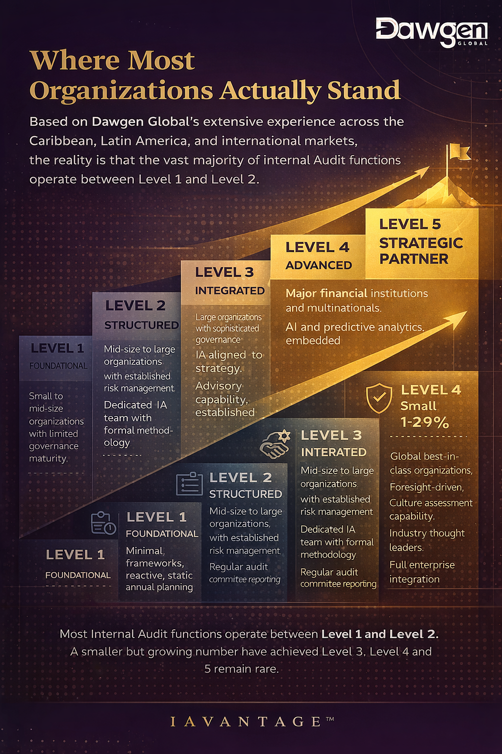 Based on Dawgen Global’s extensive experience across the Caribbean, Latin America, and international markets, the reality is that the vast majority of Internal Audit functions operate between Level 1 and Level 2. A smaller but growing number have achieved Level 3. Level 4 and 5 functions remain genuinely rare – concentrated primarily in large, heavily regulated financial institutions and multinational corporations with mature governance cultures.