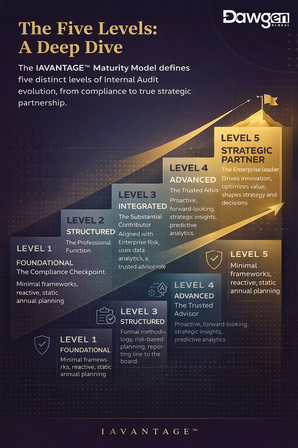 In Article 1 of this series, we diagnosed the Audit Expectation Gap – the widening chasm between what organizations need from Internal Audit and what most audit functions actually deliver. We introduced Dawgen Global’s IAVANTAGE™ Framework as the solution. In this second article, we go deeper into the engine of that framework: the IAVANTAGE™ Maturity Model.