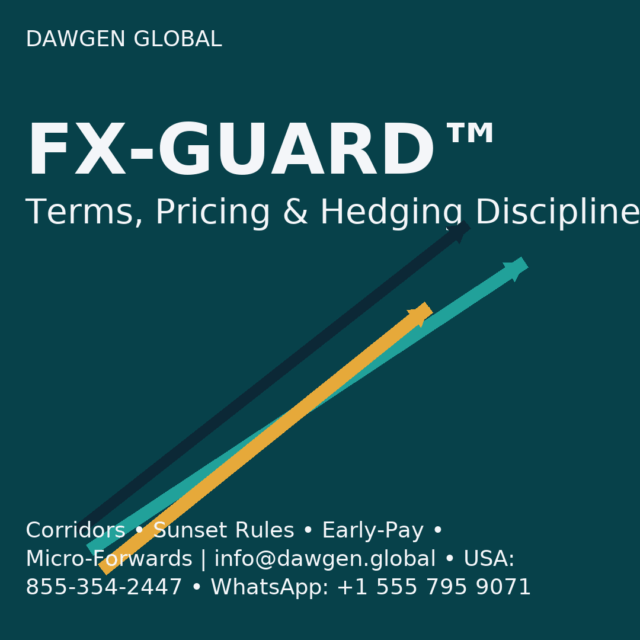 In volatile FX environments, most companies “price late and pay early.” The result: margin leakage, supplier strain, and working-capital whiplash. FX-GUARD™ is Dawgen Global’s system to hard-wire index-linked pricing, contract terms, and lightweight hedging into daily operations—so you protect gross-margin dollars (GMD) and service levels without whiplashing customers or burning supplier goodwill.
