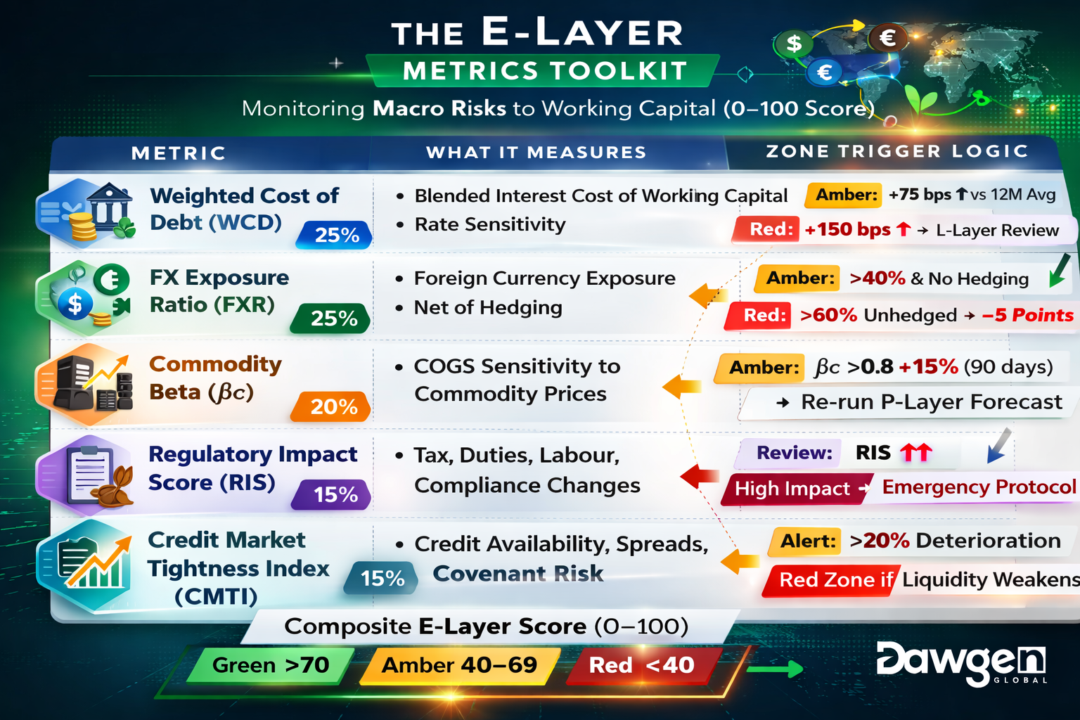 | Weighted Cost of Debt (WCD) | The blended cost of all interest-bearing working-capital facilities, weighted by utilisation. Captures the direct margin impact of rate changes on the financed portion of working capital. | WCD increase of more than 75bps versus the 12-month trailing average triggers an Amber Alert. Increase of more than 150bps triggers a Red Zone evaluation of the L-Layer’s adequacy. |