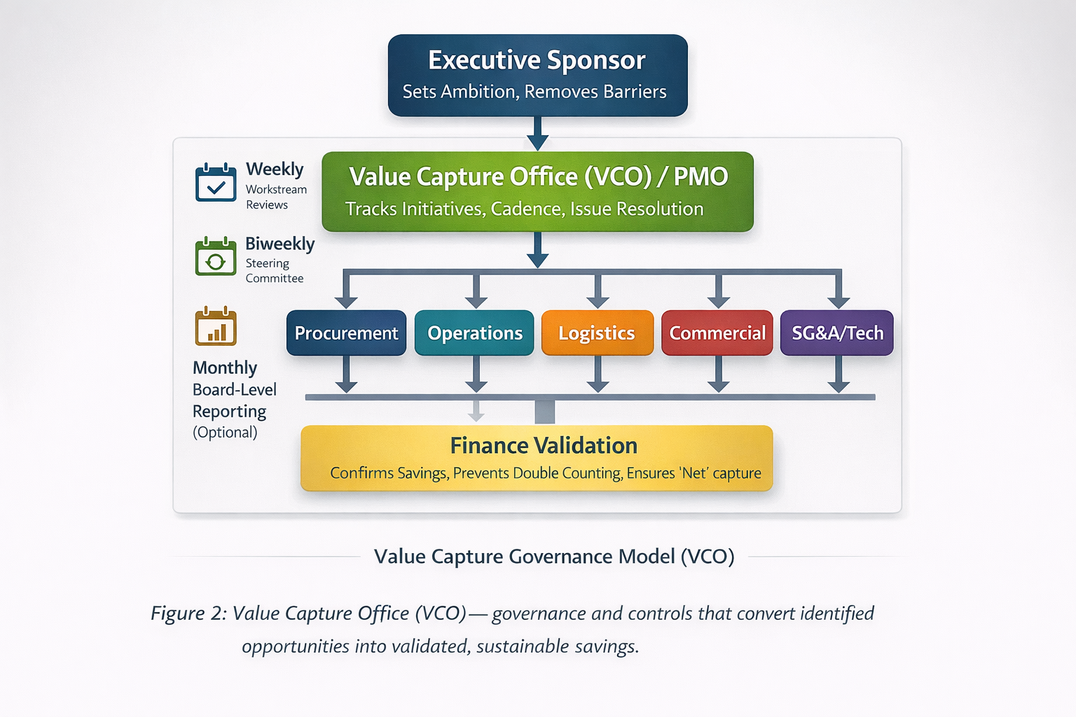 This phase introduces the concept of a Value Capture Office (VCO)—a light but disciplined governance mechanism that ensures savings become real.