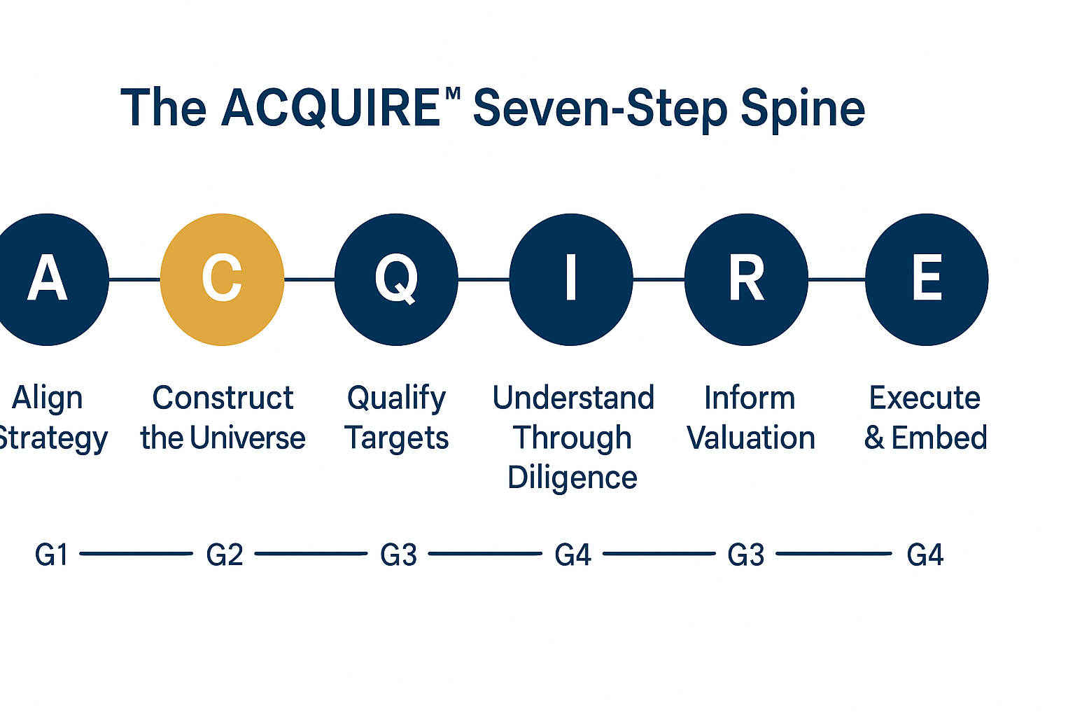 ACQUIRE360™ is anchored in a memorable seven‑step sequence—ACQUIRE™—that supplies the logic and cadence for a successful transaction. Each step has clear objectives, artifacts, and decision gates.
