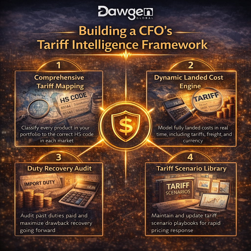 The knowledge outlined in this article is not merely academic. It forms the operational foundation for every pricing decision a company makes in the tariff era. To translate this knowledge into organizational capability, CFOs should build what Dawgen Global calls a Tariff Intelligence Framework encompassing the following elements.