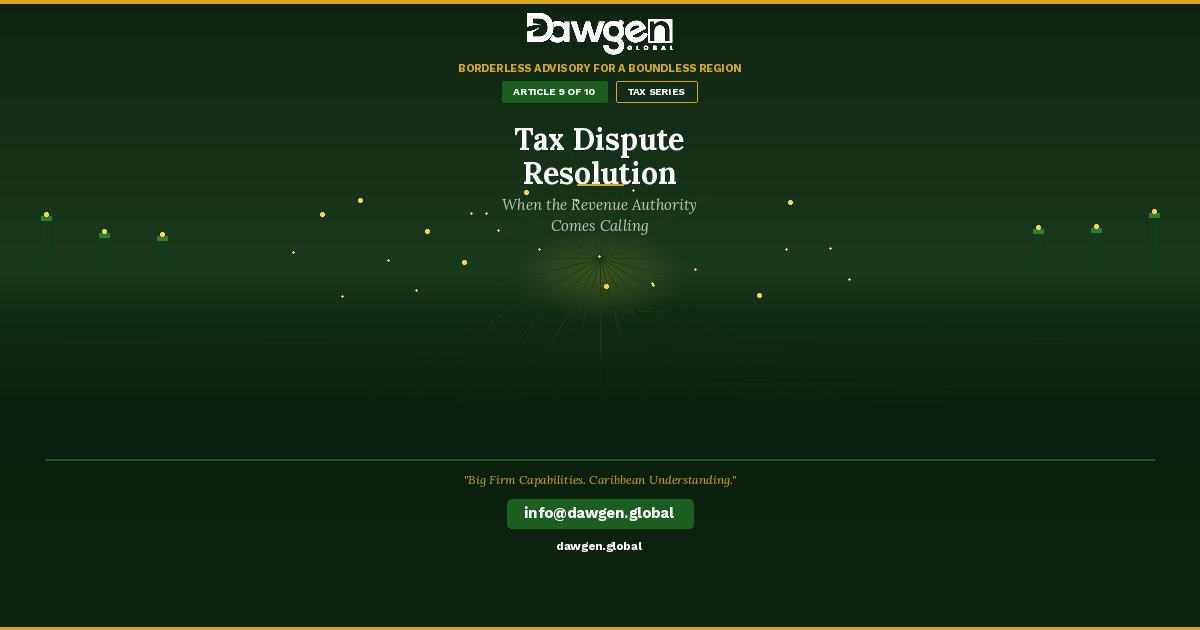 Dawgen Global invites Caribbean enterprises that are currently under audit, have received assessments they wish to challenge, or want to establish a dispute readiness framework to engage our Tax Controversy and Dispute Resolution team. Whether the dispute involves corporate income tax, indirect tax, transfer pricing, payroll tax, or any other category of Caribbean taxation, Dawgen Global provides the specialist expertise that effective dispute resolution demands.