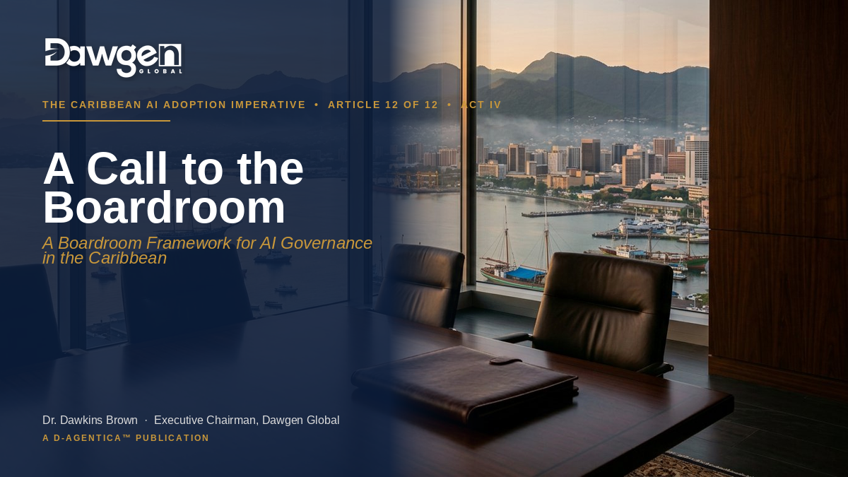 Articles 9 through 12 develop the decision. Article 9 introduces the AI Governance Decision-Rights Matrix — eleven decisions, four bodies, the structural questions Caribbean boards are not yet asking. Article 10 contextualises the matrix against three Caribbean sectors through the Sector AI Adoption Profile. Article 11 unveils the comprehensive D-AGENTICA™ Maturity Model — six domains × five stages — the structural payoff of the programme. Article 12 closes the programme without adding to its instrumentation, with the call to the Caribbean boardroom that the prior eleven articles have been building toward.