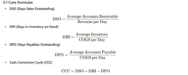 Cash (the full cash conversion cycle) — DSO/DIH/DPO tuned to your supply and customer reality.