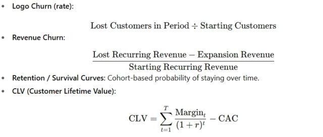 Churn: Logo & revenue churn; at-risk revenue; save rate; CLV delta