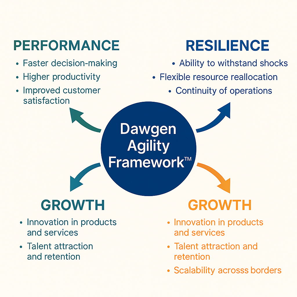Agility is not an end in itself—it is a means to measurable business impact. Too often, organizations adopt frameworks and models that sound promising but fail to deliver tangible results. At Dawgen Global, we designed the Dawgen Agility Framework™ to ensure that agility translates directly into outcomes that matter: performance, resilience, and growth.