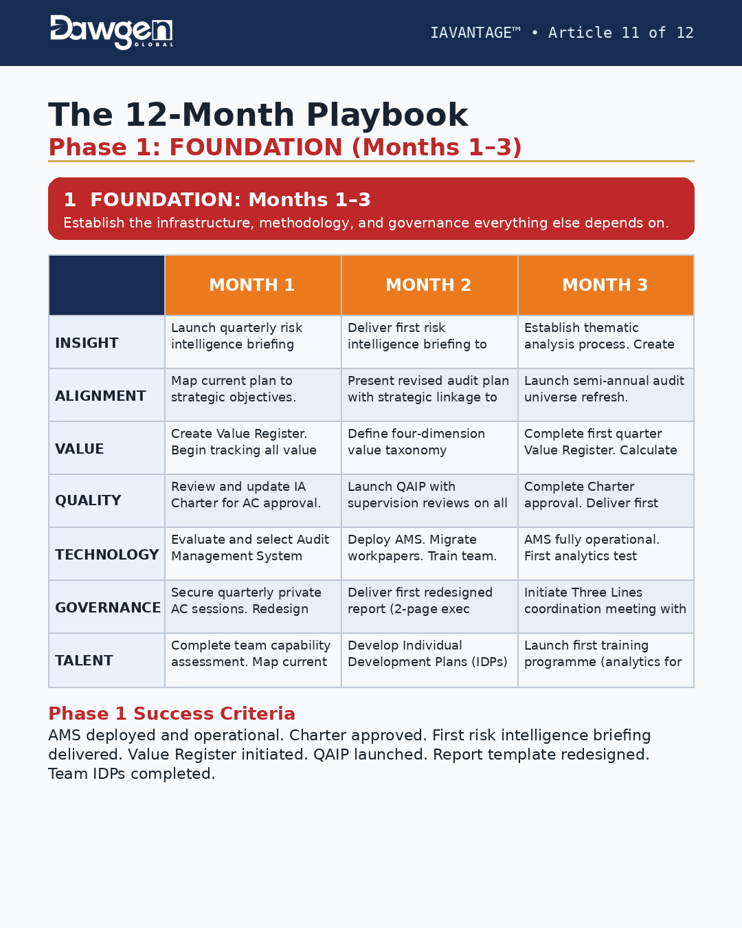 Phase 1 Success Criteria: AMS deployed and operational. Charter approved. First risk intelligence briefing delivered. Value Register initiated. QAIP launched. Report template redesigned. Team IDPs completed.