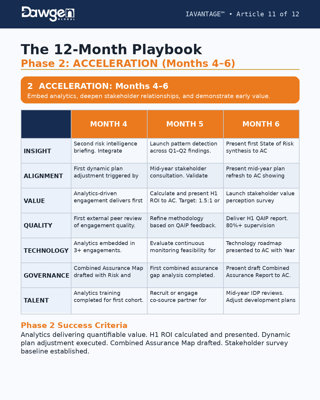 Phase 2 Success Criteria: Analytics delivering quantifiable value. H1 ROI calculated and presented. Dynamic plan adjustment executed. Combined Assurance Map drafted. Stakeholder survey baseline established.