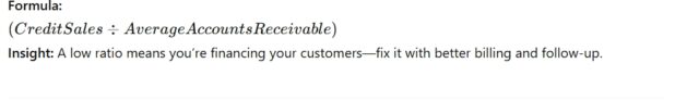 Insight: A low ratio means you’re financing your customers—fix it with better billing and follow-up.