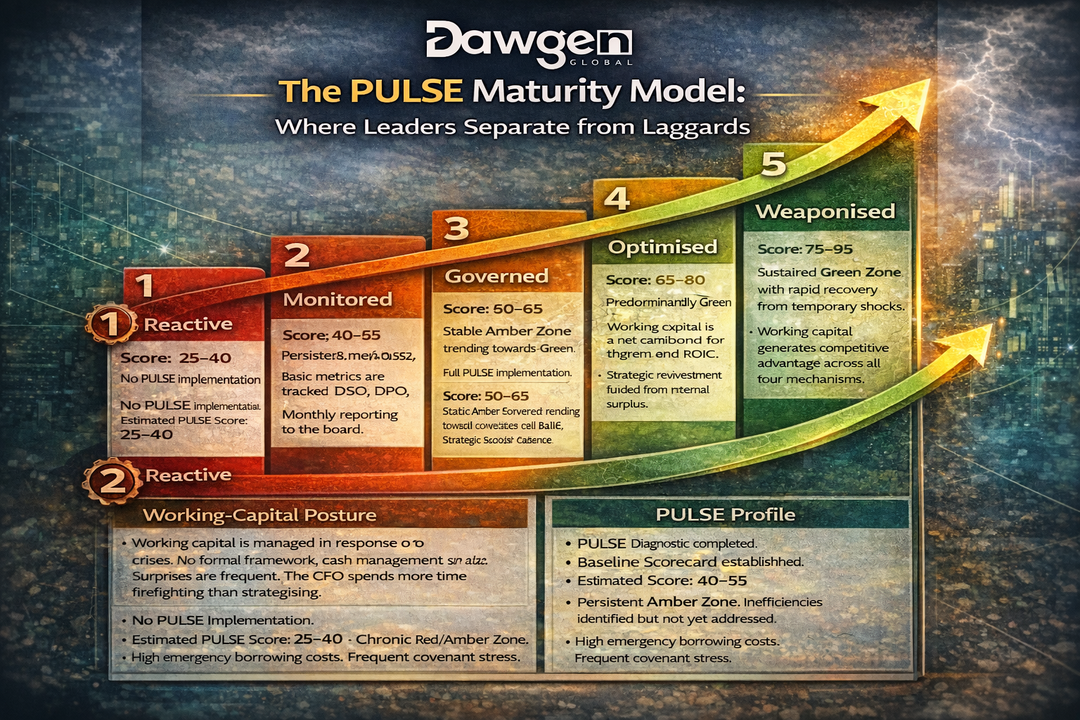 | 2 | Monitored | Basic metrics are tracked (DSO, DPO, CCC). Monthly reporting to the board. Forecast exists but is static and single-scenario. Working capital is a treasury function, not a strategic capability. | PULSE Diagnostic completed. Baseline Scorecard established. Estimated Score: 40–55. Persistent Amber Zone. Inefficiencies identified but not yet addressed. |